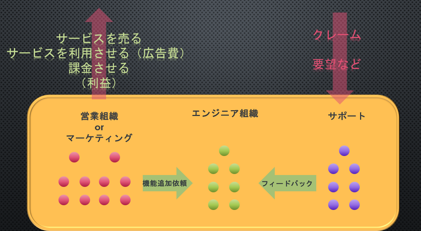 サービスを作ると儲かるではなく、サービスを使わせると儲かるである為、本来の花形部署は営業やマーケティング部署かと思われ、エンジニア部門は【より儲けるための企画】を、顧客に近い営業部門やマーケティング部門から受けて、サービスを拡張していくようなイメージになります。