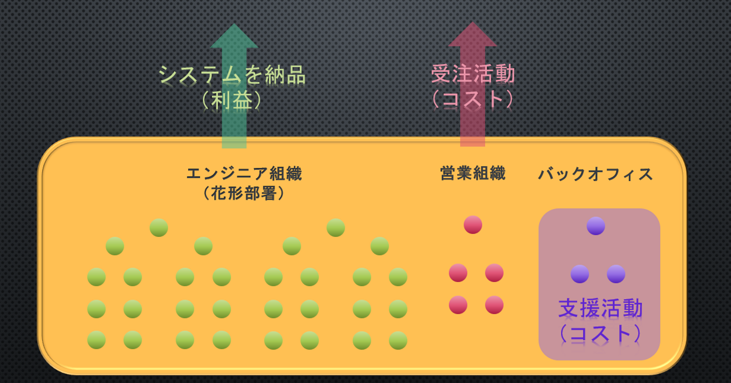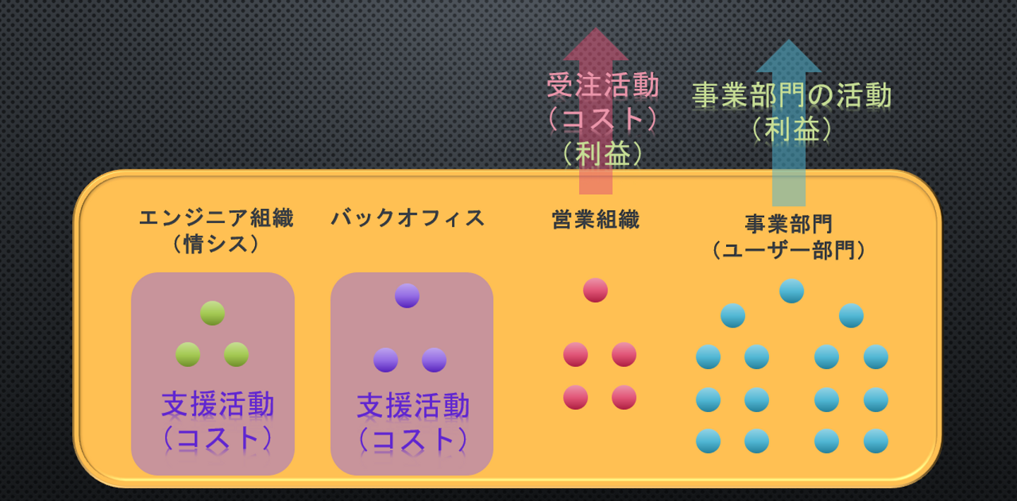 項2で説明したITベンダー(開発会社)の場合は、エンジニア組織がプロフィット・センターを担当する花形部署でしたが、非ITの事業会社においては、エンジニア組織はプロフィットセンターをはじめ、他の部門をIT技術でもって支援する立ち位置の部署になります。