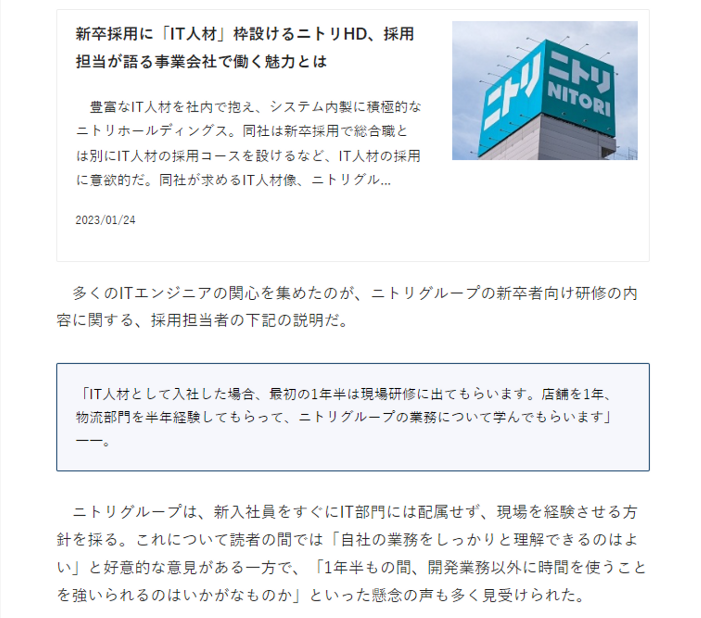 下記の引用記事は、ニトリのIT内製人材採用における育成方針が、SNSで賛否両論出まくったという件の記事なのですが。