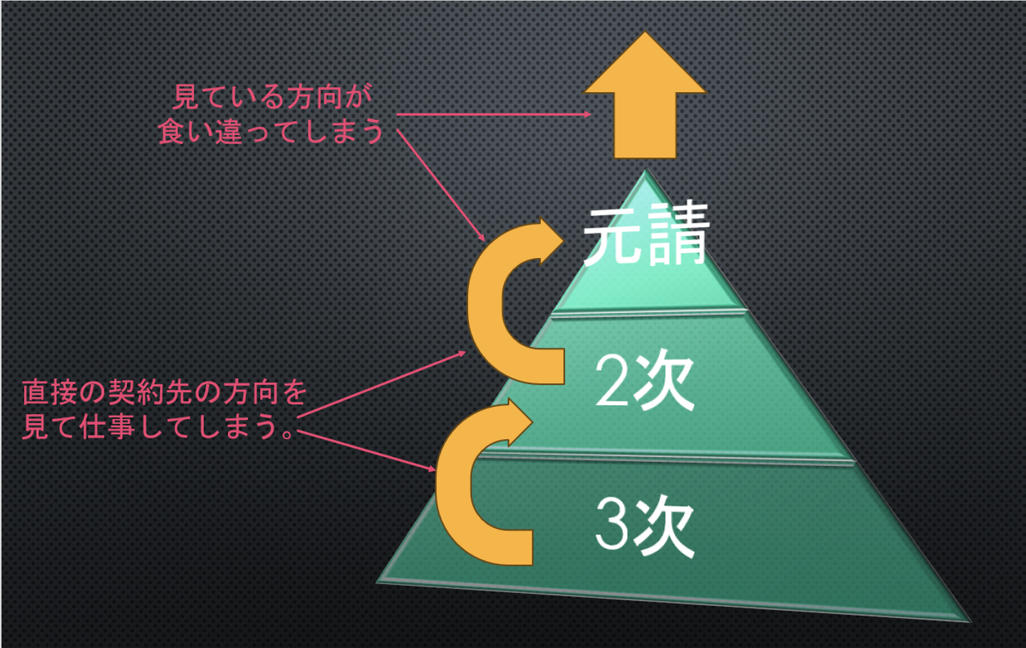 上図では、元請企業はエンドのC/Sを獲得する方向で努力しようとしていますが、2次・3次の受注者が見ている方向は、それぞれ自社の直接契約先である、元請・2次の企業です。このように目線が違う方向に向いてしまった場合、高い能力や主体性を有していたとしても、活かされる事はあまりありません。『下請け根性』とか言われて嫌われる傾向のある要素ですね。