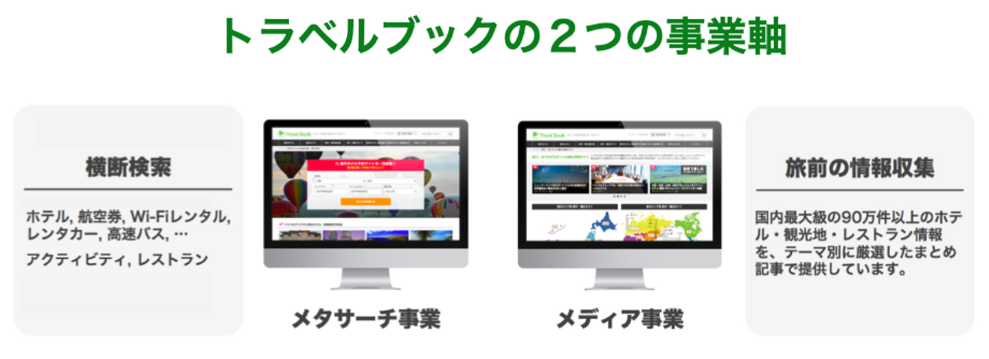 ホテルをはじめパッケージツアーやレンタカー、高速バス、レンタルWi-Fi、オプショナルツアーといった旅行商品の料金比較機能(メタサーチ)を提供する旅行情報サイト「トラベルブック」を運営しています。「旅行者によりよい選択肢を与え、意思決定を支援する」をミッションに掲げ、メタサーチとメディアの二軸でサービスを展開。旅行行動の中心となる予約アクションにフォーカスした横断検索ツールと、実用的な旅のガイドコンテンツを提供しています。