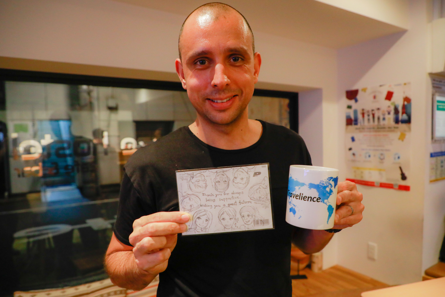 会社のロゴの入ったマグと、ポストカード。カードには全員の似顔絵付き!