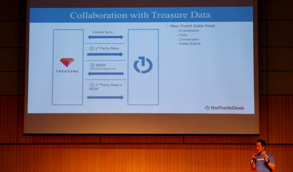 「TREASURE CDP」との連携では、通常のDMPからDSPという一般的なプロセスとして「TREASURE CDP」で作ったセグメントをDSPに投げてそれを基に配信するということは当然として、TTDから先程の「Raw Event Data Stream」機能を用いて インプレッションやクリック、コンバージョン、ビデオイベントなどの生データを「TREASURE CDP」に戻します。それを「TREASURE CDP」で分析し、改めてセグメントを作ったうえでDSPに返して配信に活用するという連携を行っています。