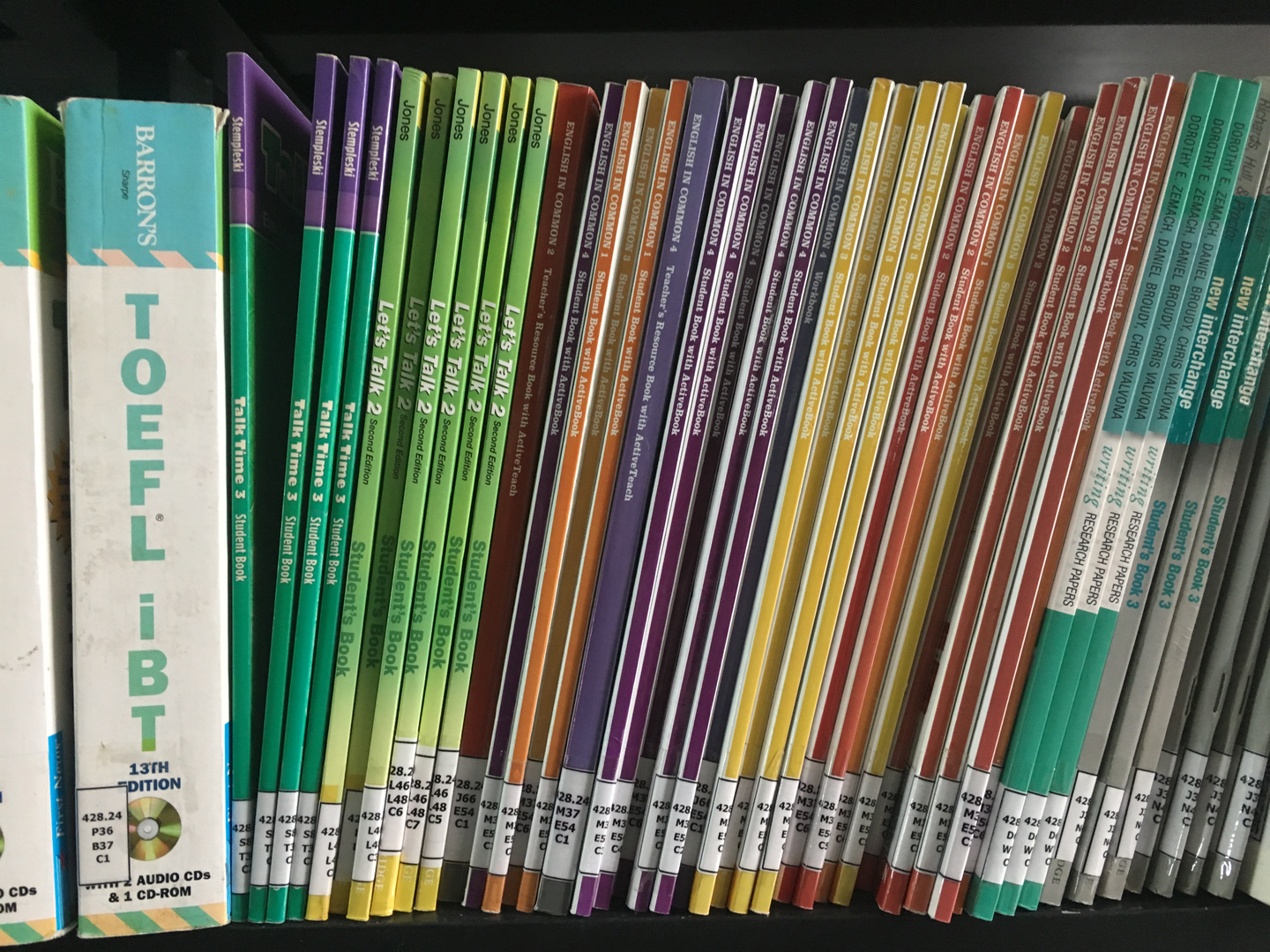日本の大学のように、英語試験の問題集が多数取り揃えてあったり、、、