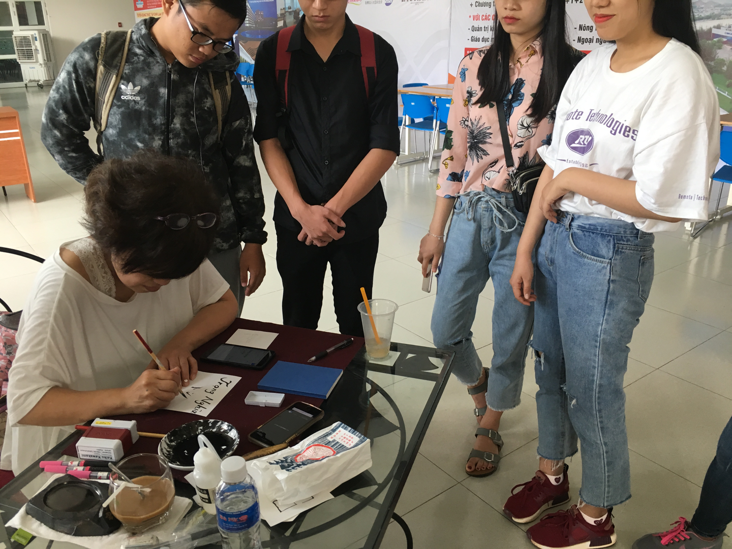 中でも書道のコーナーは大人気で、書道家の方が学生の名前を紙に書いてプレゼントするといったものなのですが、やはり書道の美しさはベトナム人にも大人気で、終始列が途切れることはありませんでした。