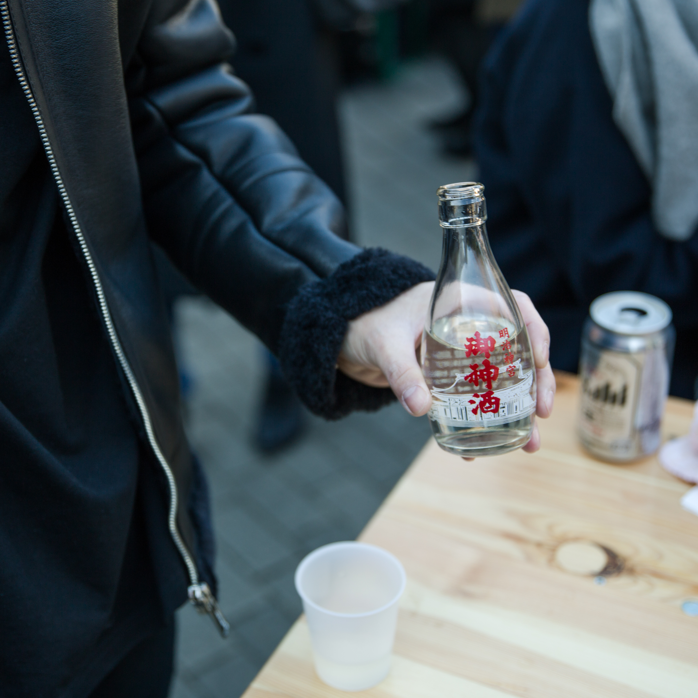 参拝が終わるとにぎわう屋台の方へ。全員輪になり御神酒で「今年もよろしく!」と乾杯!