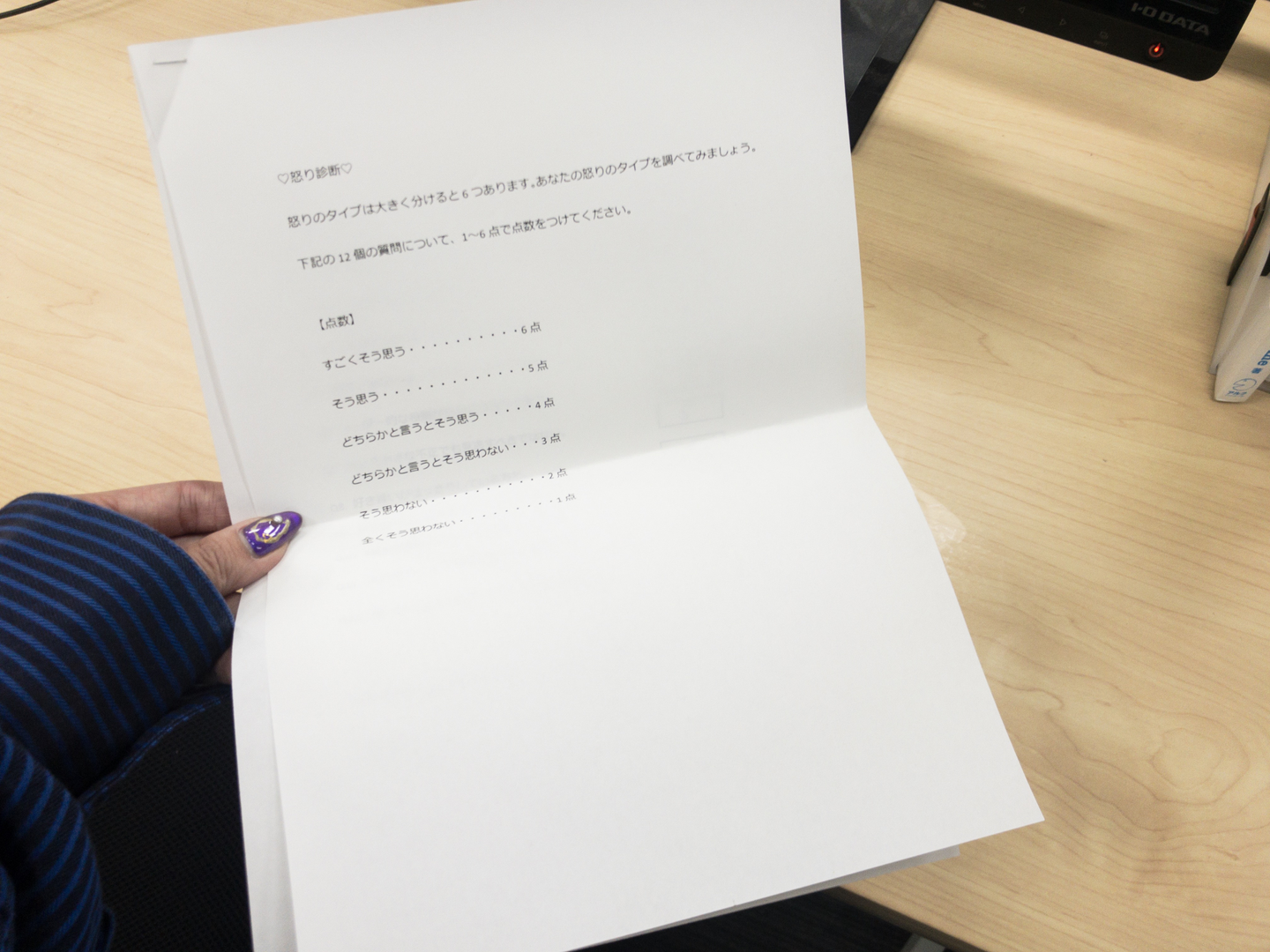 では「自分の怒りの傾向を知ろう!」と言うことで彩花ちゃんが資料を配り始めました。