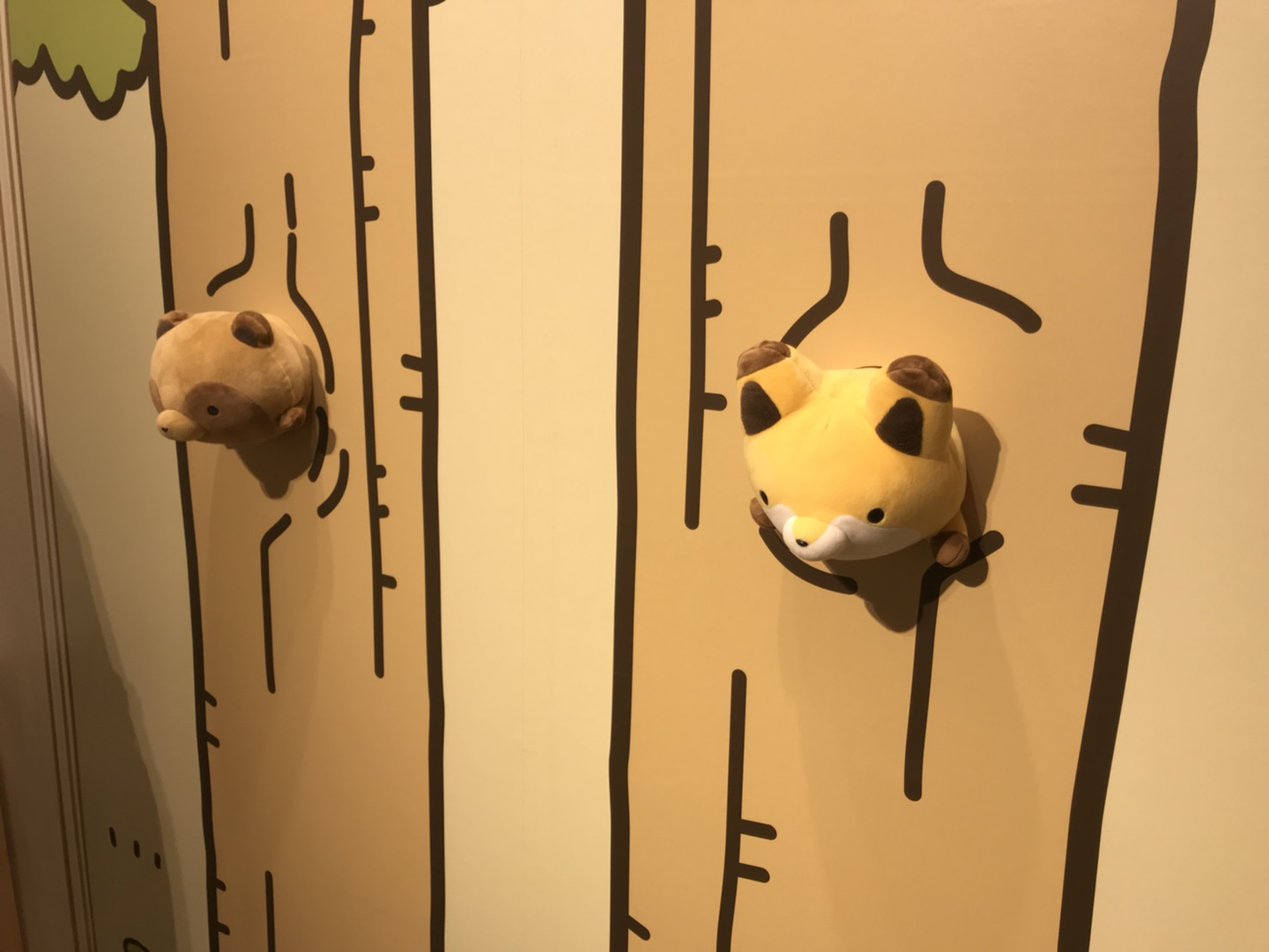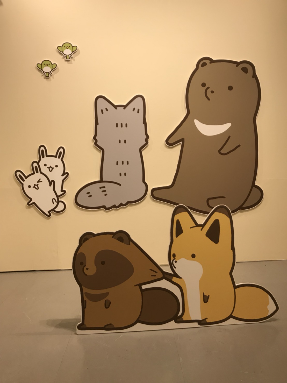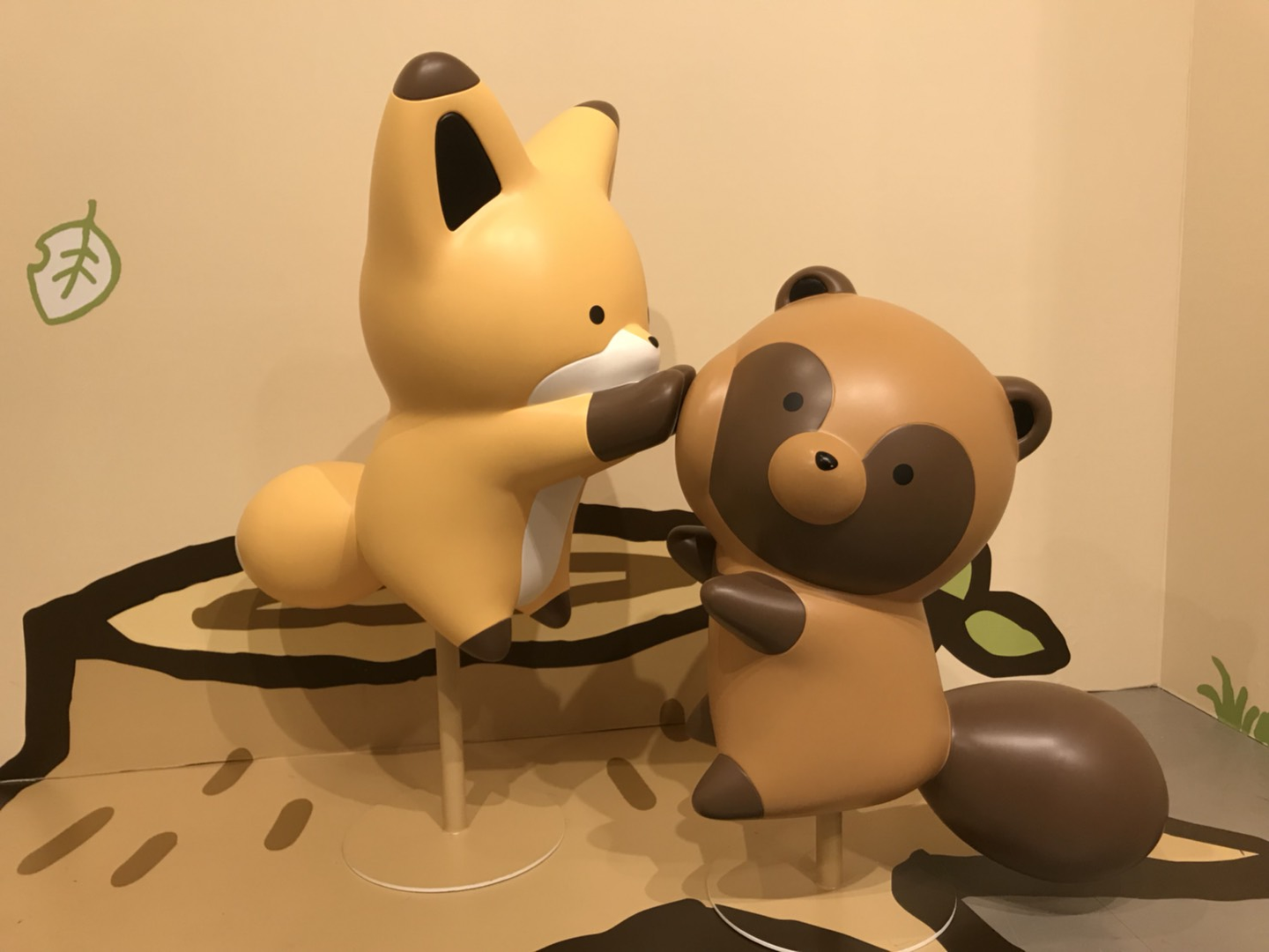 イラストのパネル展示に加え、タヌキとキツネ達と一緒に写真撮影ができるフォトスポットなど様々な展示物があり、タヌキツの今までを振り返りながら楽しめた。