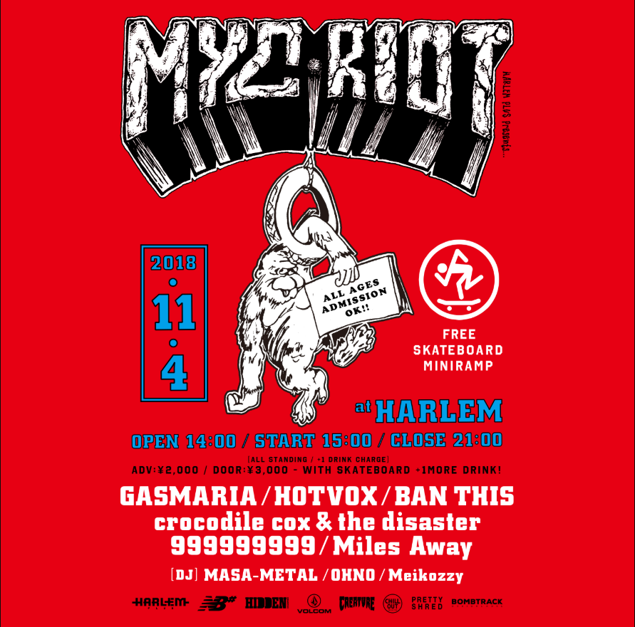 ( OPEN : 14:00 / START : 15:00 / CLOSE : 21:00 / ADV : ¥2000 / DOOR : ¥3000 - WITH SKATEBOARD + 1MORE DRINK!)