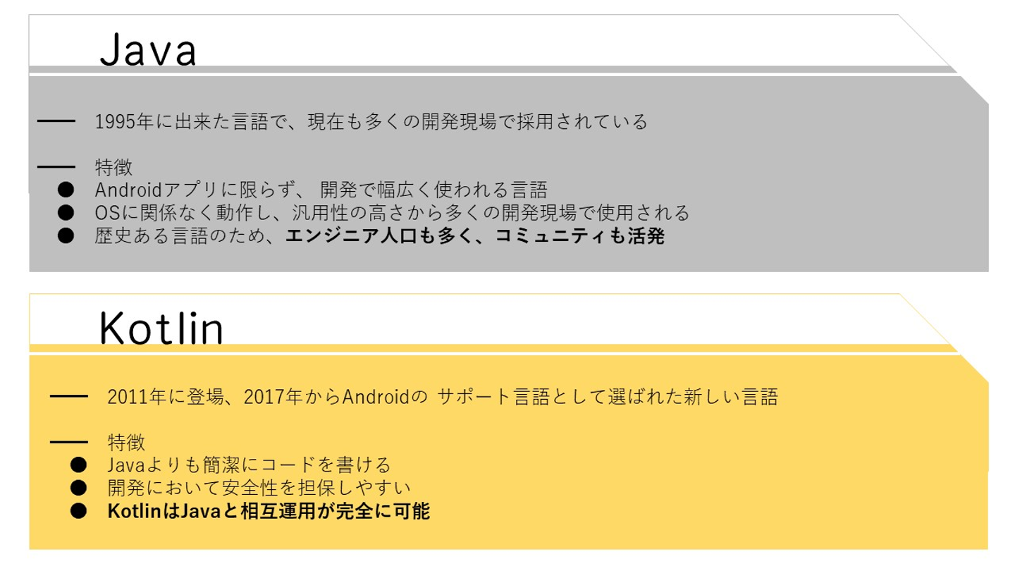 2019年5月にAndroidの推奨言語として採用されましたが、まだ使用経験のあるエンジニアが少ないです。そのため、Kotlinのスキルは、どんどん需要が増していくと予想しています。