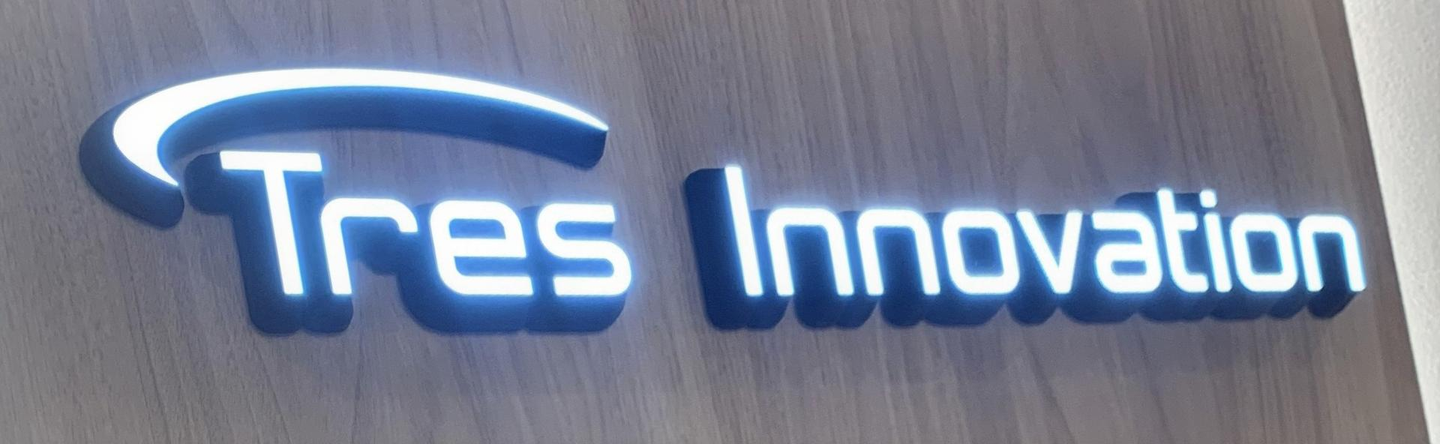 エレベーター降りたら目に入るTres Innovationのロゴ。