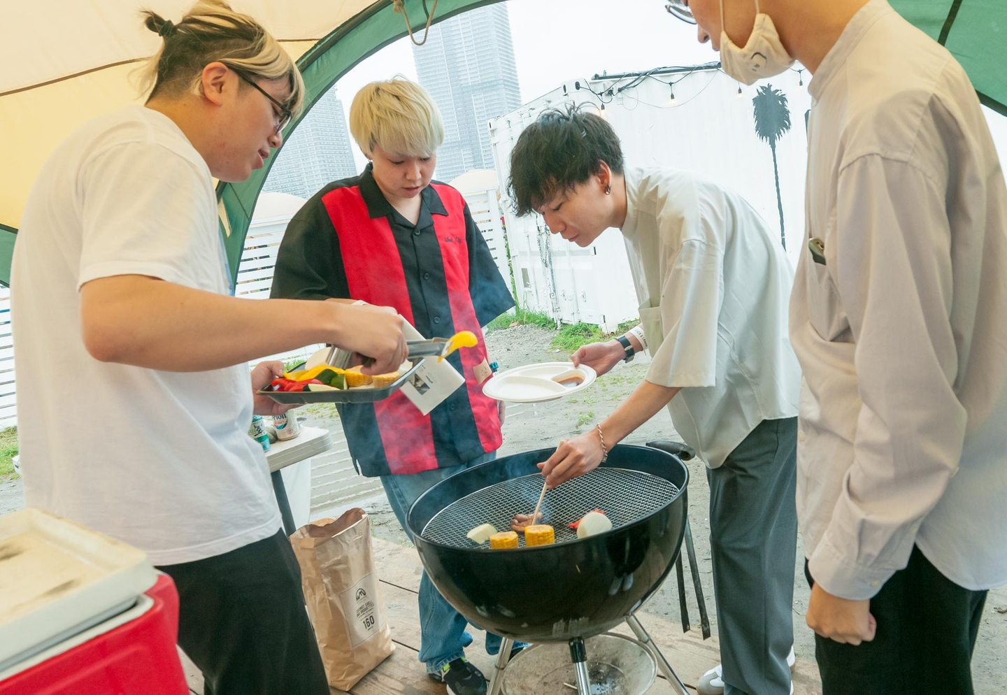 一斉に焼きにかかる腹ペコなメンバーたち🍖🥬🌽🍆