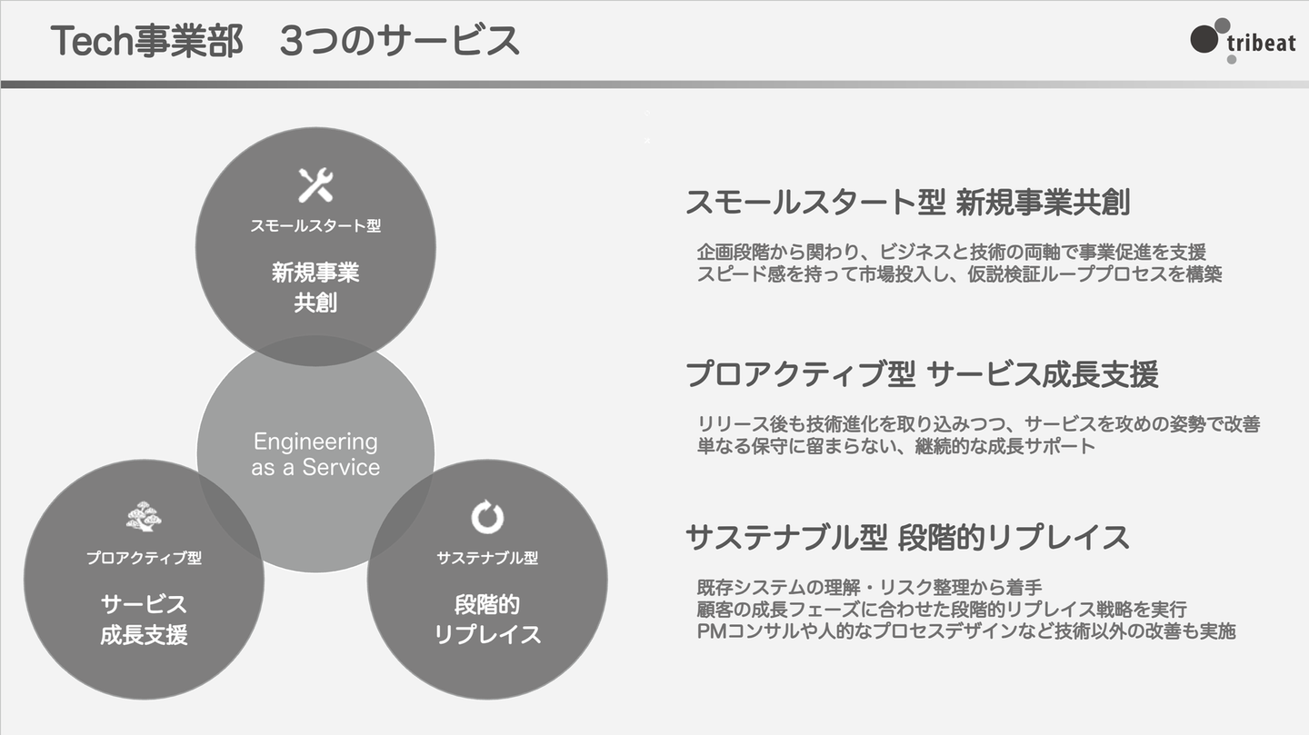 トライビートのTech事業部では、多様な事業フェーズや技術課題に応じて、以下の3つのエンジニアリングサービスを提供しています。いずれのサービスにおいても、クライアントとの密な連携と、事業成長に向けた持続的な技術支援を重視しています。