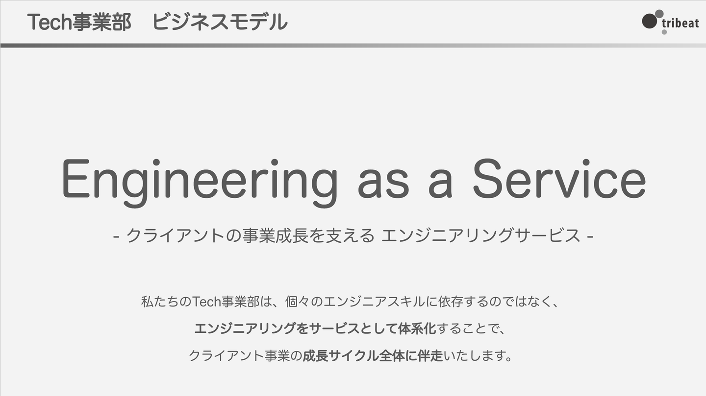 私たちトライビートのTech事業部では、エンジニアリングを「人」ではなく「仕組み」として提供することを目指しています。クライアントワークにおいては、担当者のスキルや経験に依存する傾向がありますが、それでは継続的で再現性のある価値提供にはつながりません。