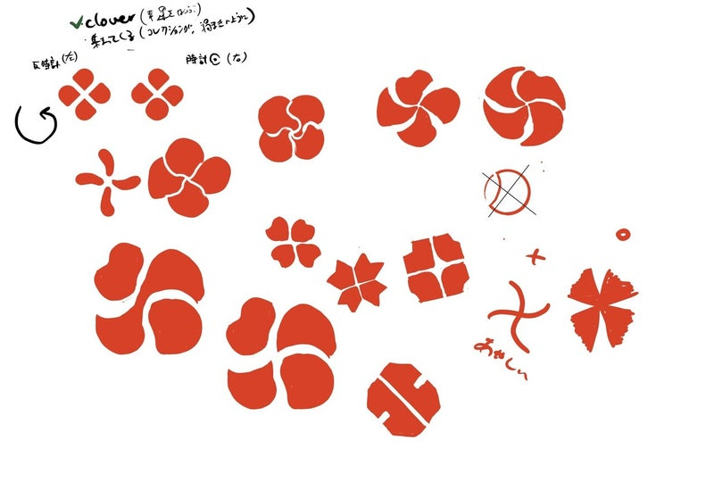 そこで、モチーフの中の「4つのパーツが集まっている」という特徴だけ継承して、もう一つのアプローチである「より単純で明快な形にする」方向性で案出しを進めました。