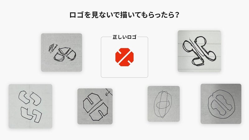 試しに、一番長くロゴを見ているであろう弊社メンバーに現状のロゴを見ずに描いてもらうことにしました。すると、ほとんどのメンバーが正しいロゴを描けず...。