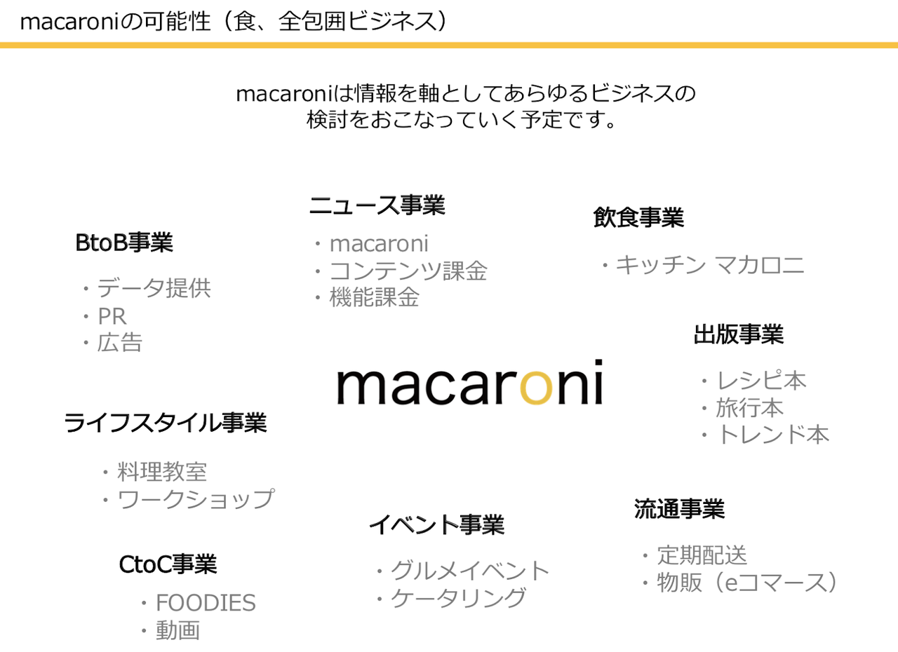 世古:当時の構想としては、食の全包囲ビジネス、女性に最も愛されるグルメニュースプラットフォームとして、メディアmacaroniを起点に、飲食店、出版事業、Eコマース、イベントやケータリング事業、当時のVineやPeriscopeを意識したLive配信アプリ(CtoC)、料理教室、データ提供を考えていました。海外のFood Networkという食専門のテレビ局を見たりして、エンタメ要素を強くしていきたいとも考えていました。