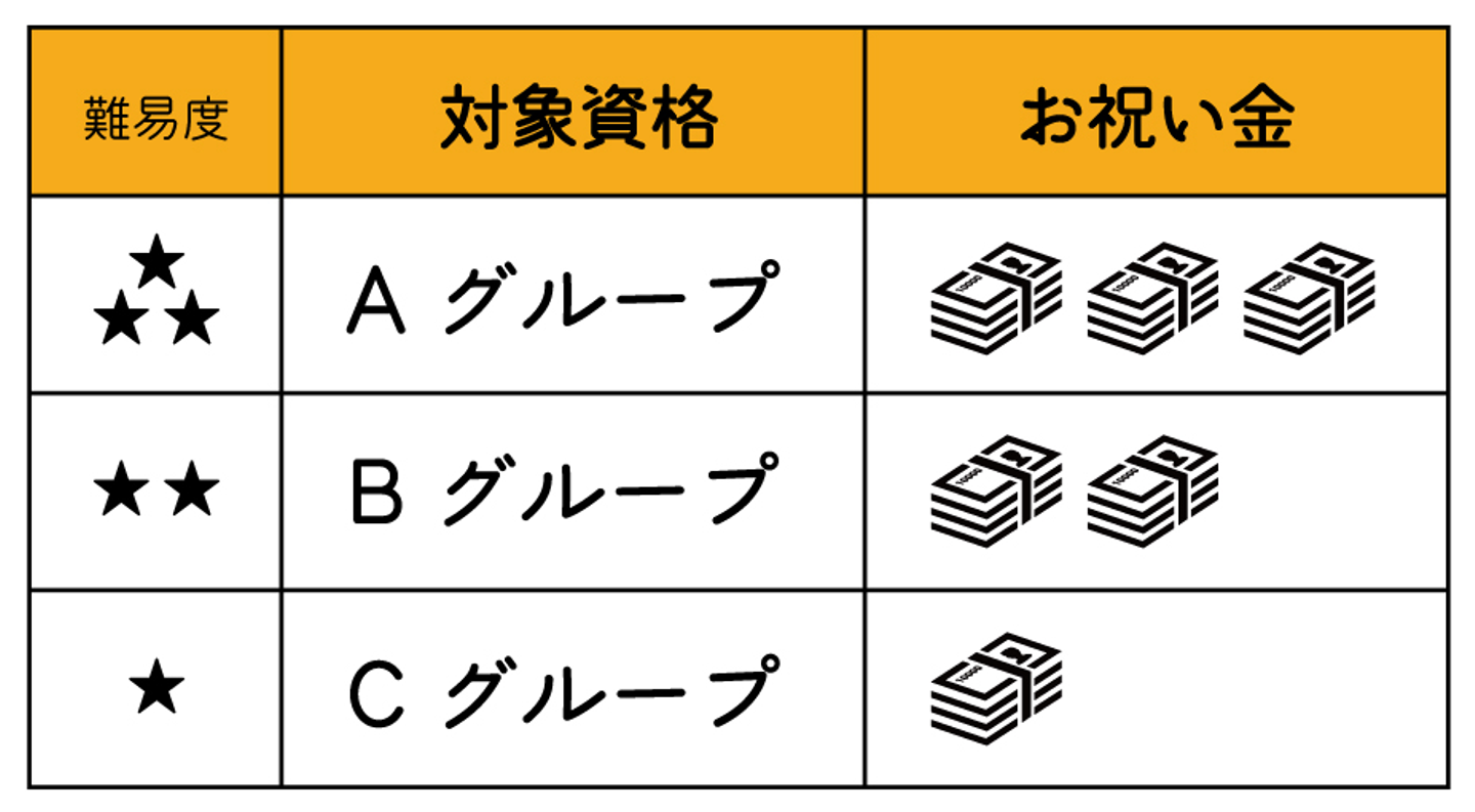 この制度は、ツクリエが選んだ「対象資格」を「難易度別」にグループ分けし、各グループによりお祝い金の金額が変わるというもの。