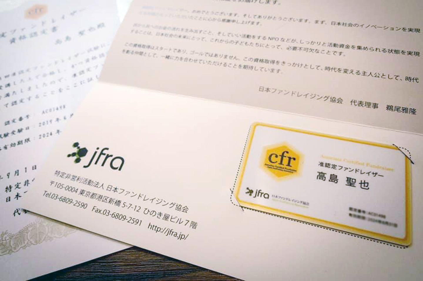 「ツクリエ入社前に独学で取得した准認定ファンドレイザーが、起業相談のときに役立っています。ファンドレイザーというのは、民間非営利団体での資金調達を行う専門家のこと。