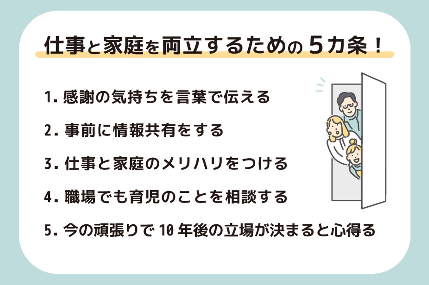 渡邉「僕の場合は、職場の人たちにも子育てについてよく話をしますね。もちろん業務中は仕事に集中しますが、あえて職場で公私の境界線を引かずに相談させてもらうことで、子どもの体調不良などで急にお休みをもらう時にサポートしていただけて、助かってます!」