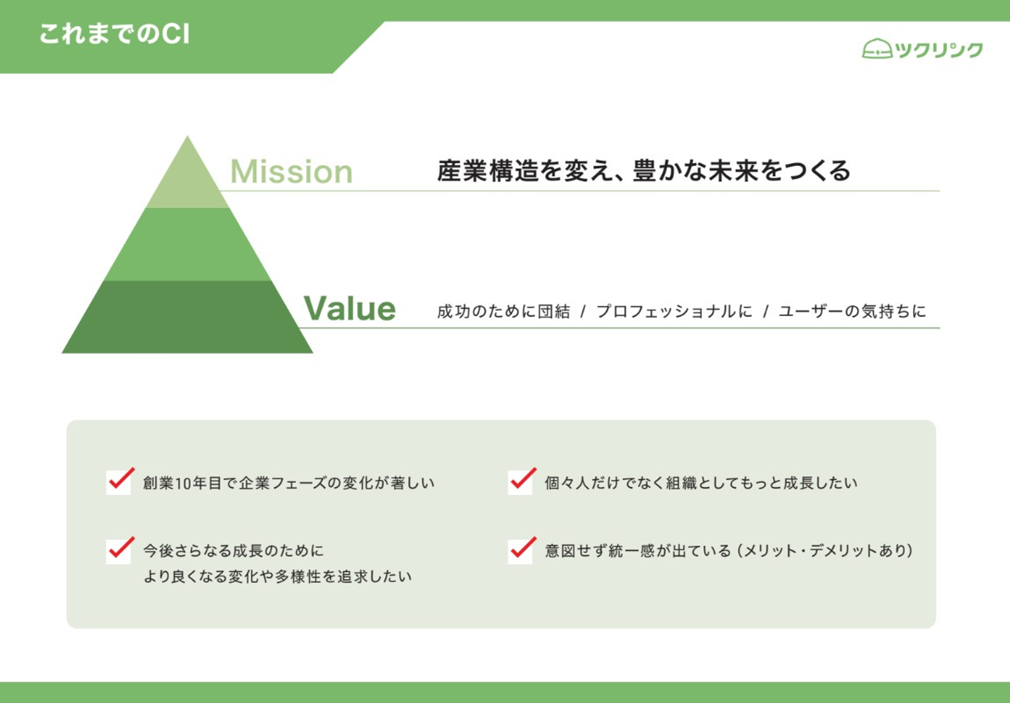 ツクリンク株式会社としてパーパスはこれまでと変わりませんが、今回のCI改定で具体的にどのような意識で個々人が日々の仕事をしていくと良いのかなど、価値観やマインドのような目に見えないものが言語化・基準化されることで分かりやすくなりました。