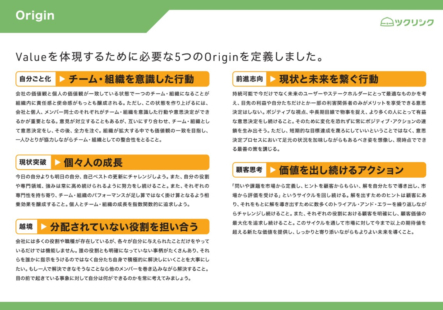そこに行動指針である「バリュー」、ツクリンクのDNAや価値観である「オリジン」へと繋がっています。この「オリジン」ですが、一般的には”クレド”などの表現を用いられる事が多いです。ツクリンクでは「パーパス」「バリュー」を体現していく行動や価値観は個人の成長・会社の成長の源泉/源であると考えているため、「オリジン」という名称にしました。