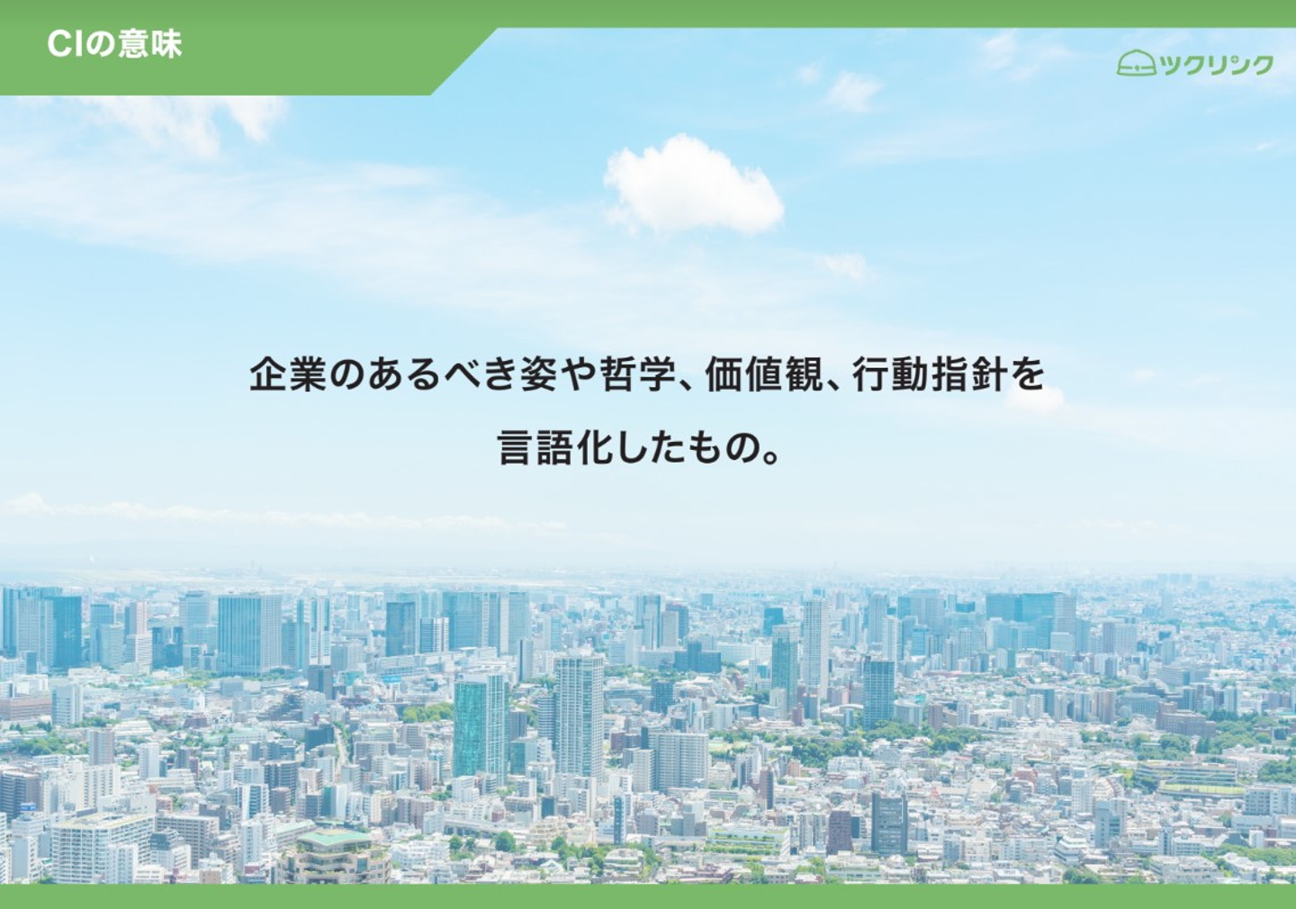 企業ロゴやブランド名などもCIの一つですが、本CIの意味するところは上記のような会社としての指針や方向性、大事にしている価値観等となります。