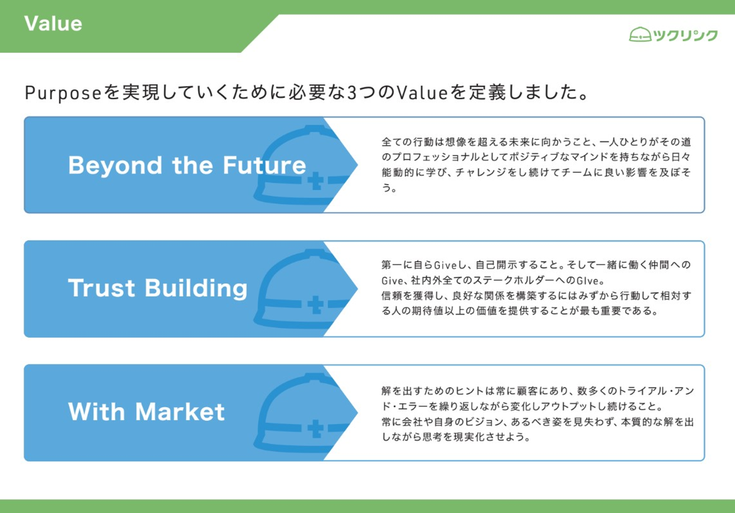 そこで、これからの非連続な成長のために、改めてツクリンクにおける価値観や目指すべきものなどを言語化し、認識の統一を図る事にしました。