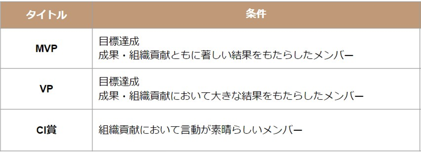 突然ですが、弊社には「MVP」「VP」「CI賞」という表彰制度があります。定量面と定性面で会社に貢献したメンバーを半期毎に称えるこちらの表彰制度。