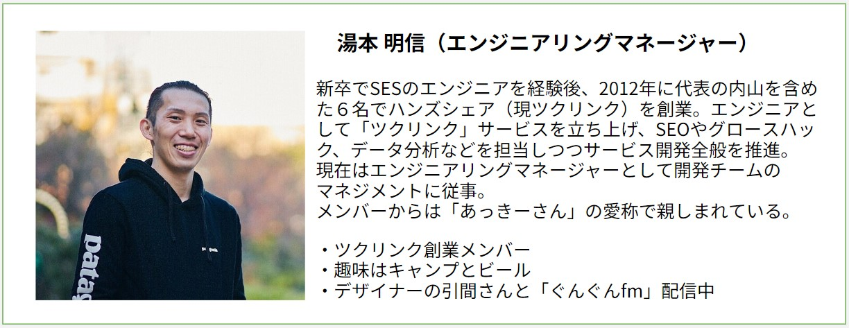 そういう人たちなので、同僚をリスペクトして適切に議論・コミュニケーションをしたり、意見を尊重することをチームとして大切にしています。Googleのエンジニアには「HRT」humility・respect・trust(謙虚・尊敬・信頼)という価値観があるのですが、ツクリンクにもまさにそういう人たちが集まってきているなと感じています。