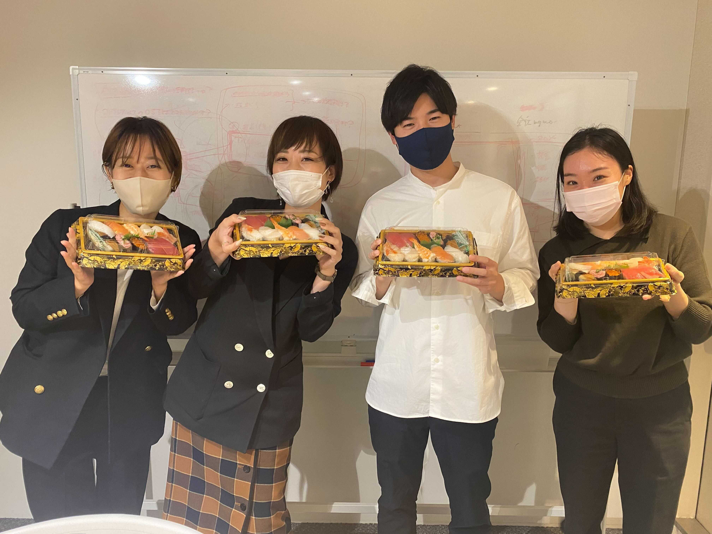 前期と今期で2Q連続でUnit達成した時の写真です!部長からお祝いのお寿司をいただき、後日unit達成金でエビ・カニのフルコースを食べにいきました♪