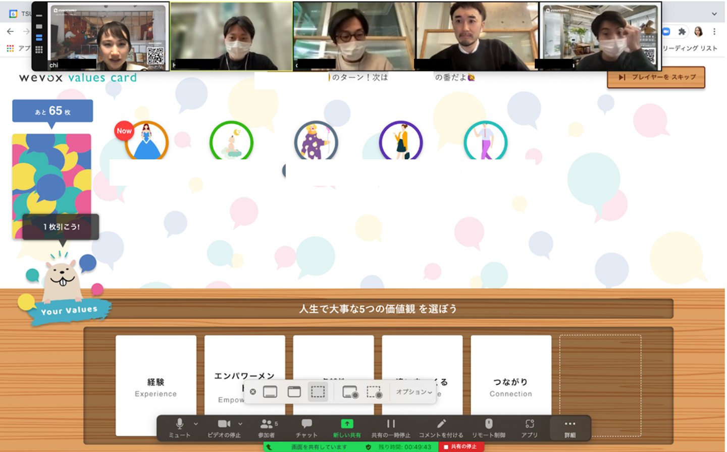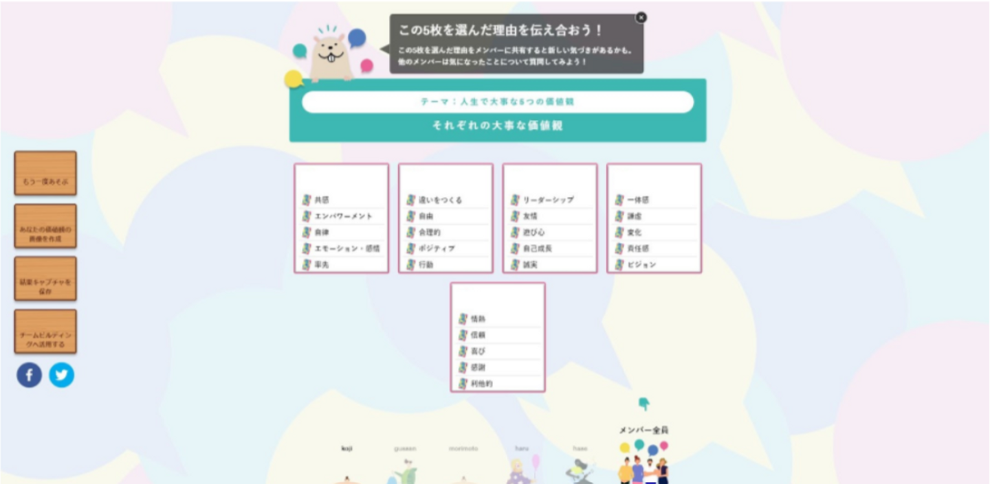 手元に残せるカードの枚数は5枚。どの価値観(カード)を残し、どの価値観(カード)を捨てるのか、悩んで、笑って、楽しんでワークをしている様子が伺えました。