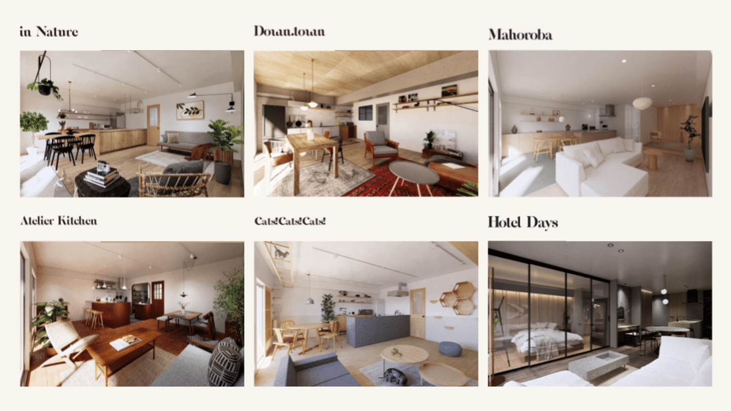 それに対して「ライフカタログ」では、暮らしのイメージごとに家具や観葉植物も含めてトータルコーディネートしたパッケージを用意しており、カタログをめくるようにパッケージを選ぶだけで、想い描いた自分らしい暮らしを手に入れることができます。