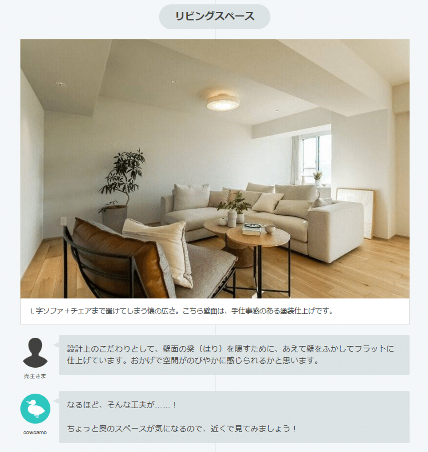 既存の住宅情報サイトでは、エリアや価格、間取りなどのスペックを中心に掲載しているのが一般的ですが、カウカモでは、ストーリー仕立てで物件を紹介していることが大きな特徴です。