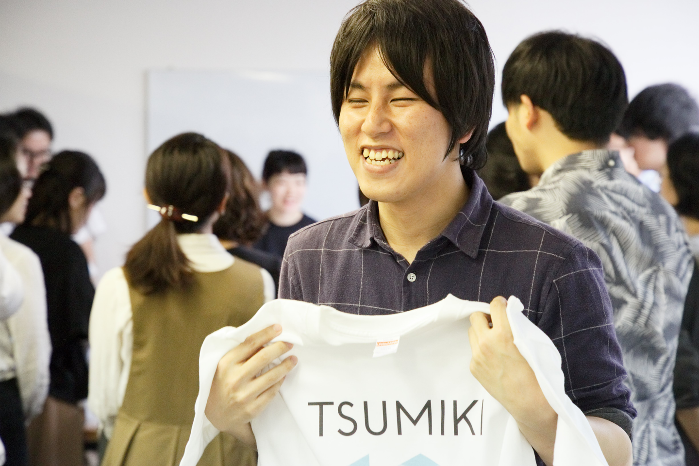 仕上がったTシャツを見て喜んでいる社員たち。とっても嬉しそう。
