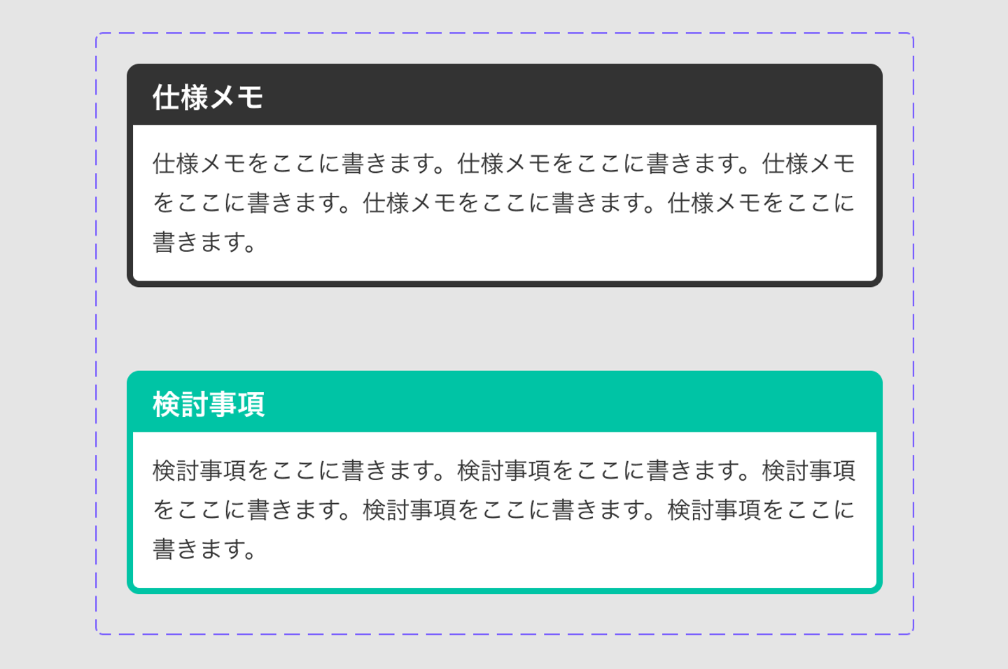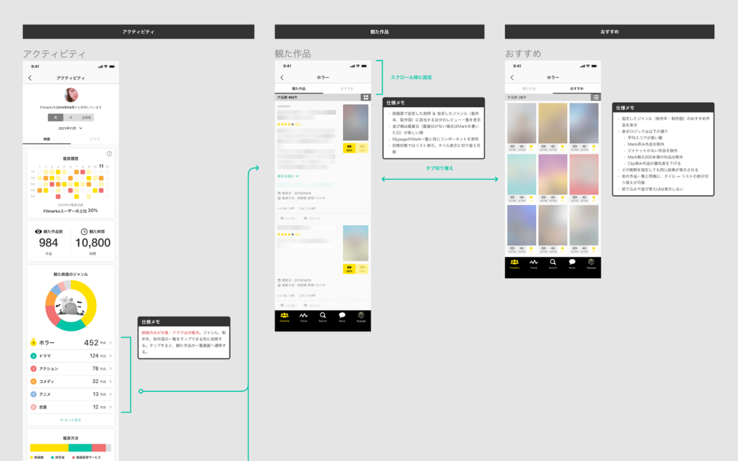 この際、UIの挙動や一覧の並び順、表示条件や画面遷移など表示に関わる仕様が、担当者にとってバラバラにならないように、こうしたメモや矢印、見出しのコンポーネントを用意し共有しました。