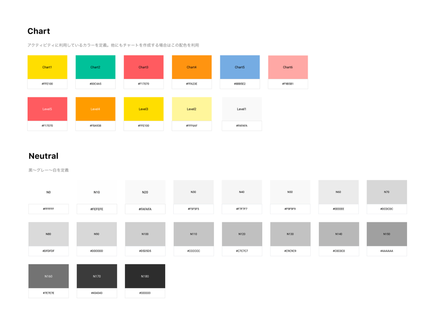 Chartでは役割+数値を使い、Neutralには白、グレー、黒の無彩色を分類し、明度順で数値を振ります。