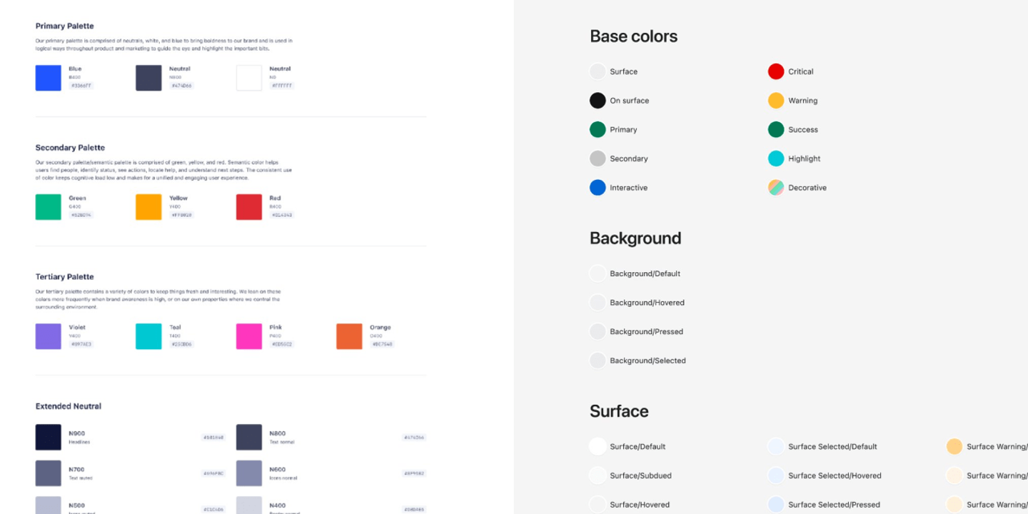 まずPrimaryとSecondaryは種類による分類を採用しました。このカテゴリでは単一のカラーが複数の役割に使われていることが多く、役割でカラーを分類すると定義が増えすぎてしまうことが予想できました。Extendedでは原則として役割別の命名を採用しました。