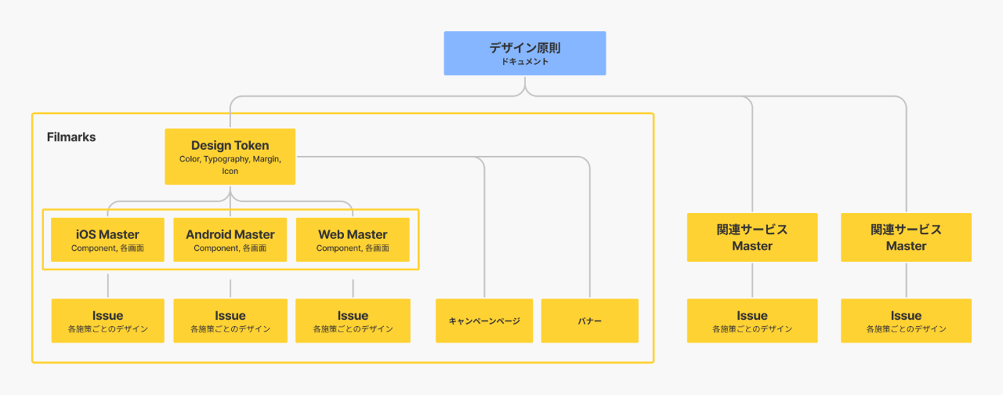 その他に複数の関連サービスがあるため、これらすべてを包括するデザイン原則をドキュメントとして定義し、Figmaファイルはサービス毎に分離します。Filmarks内ではColor、Typography、Margin、Iconといった共通部分をDesign Tokenとして定義し、その配下に各プラットフォームのMaster Designを。さらにその配下に施策毎のIssueに紐付いたファイルを作成する構成としました。