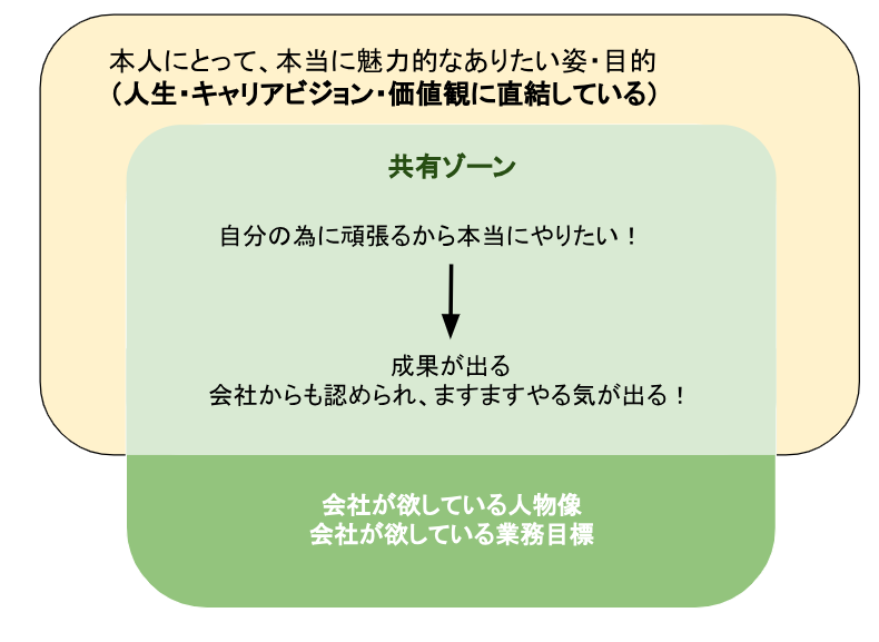 今の仕事が将来の自分のなりたい理想像にどのようにつなげがっていくか、より具体的なアクションプランを組み込んだ目標設定をMBOに落とし込んでいきます。