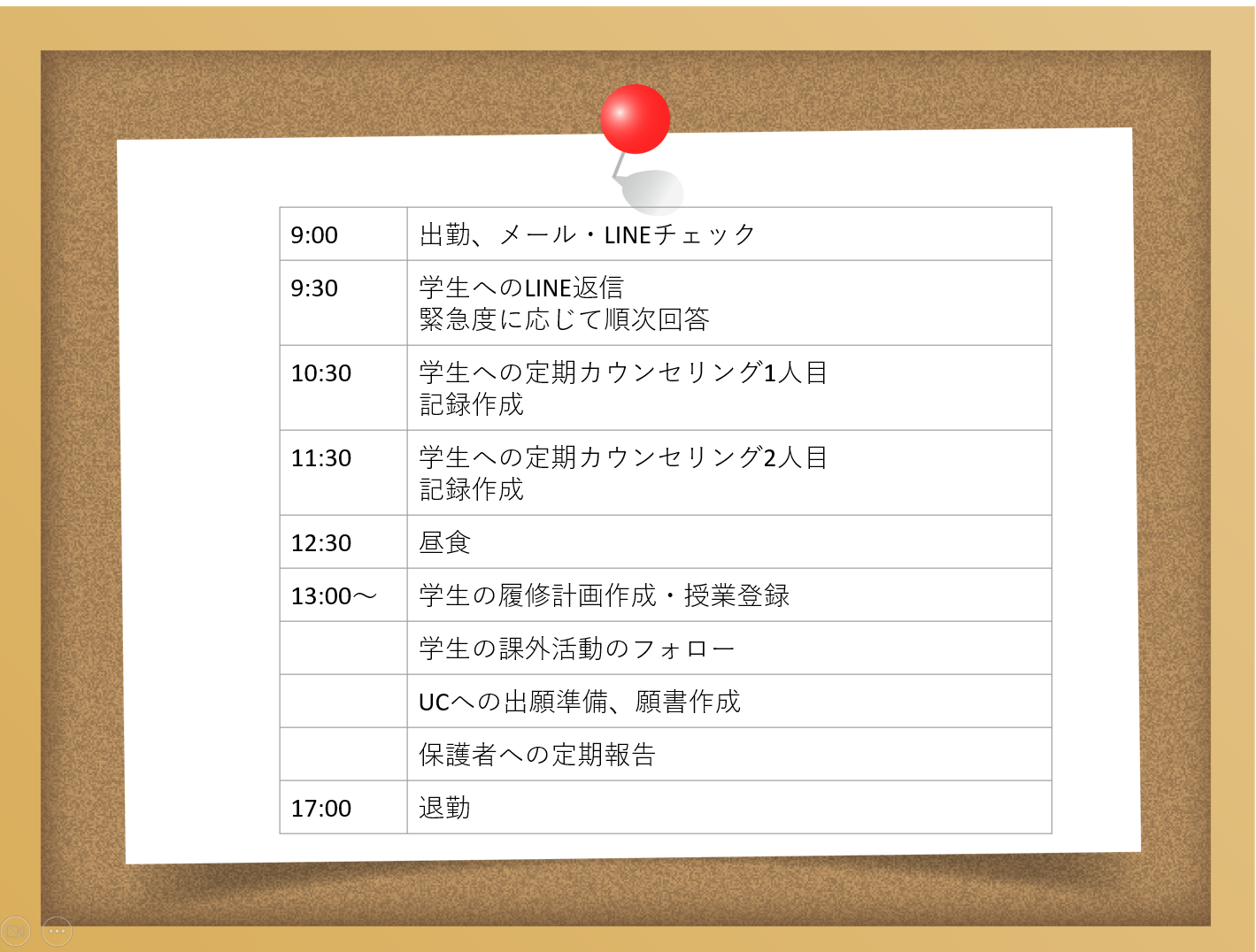 ※出願願書作成サポート、学生の課外活動・エッセイの作成サポート、授業登録、TAG申請、等