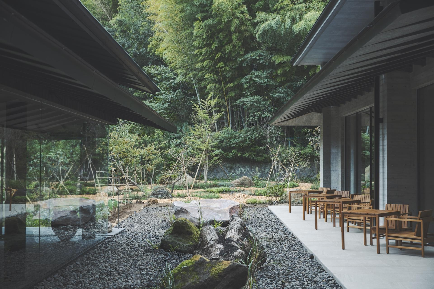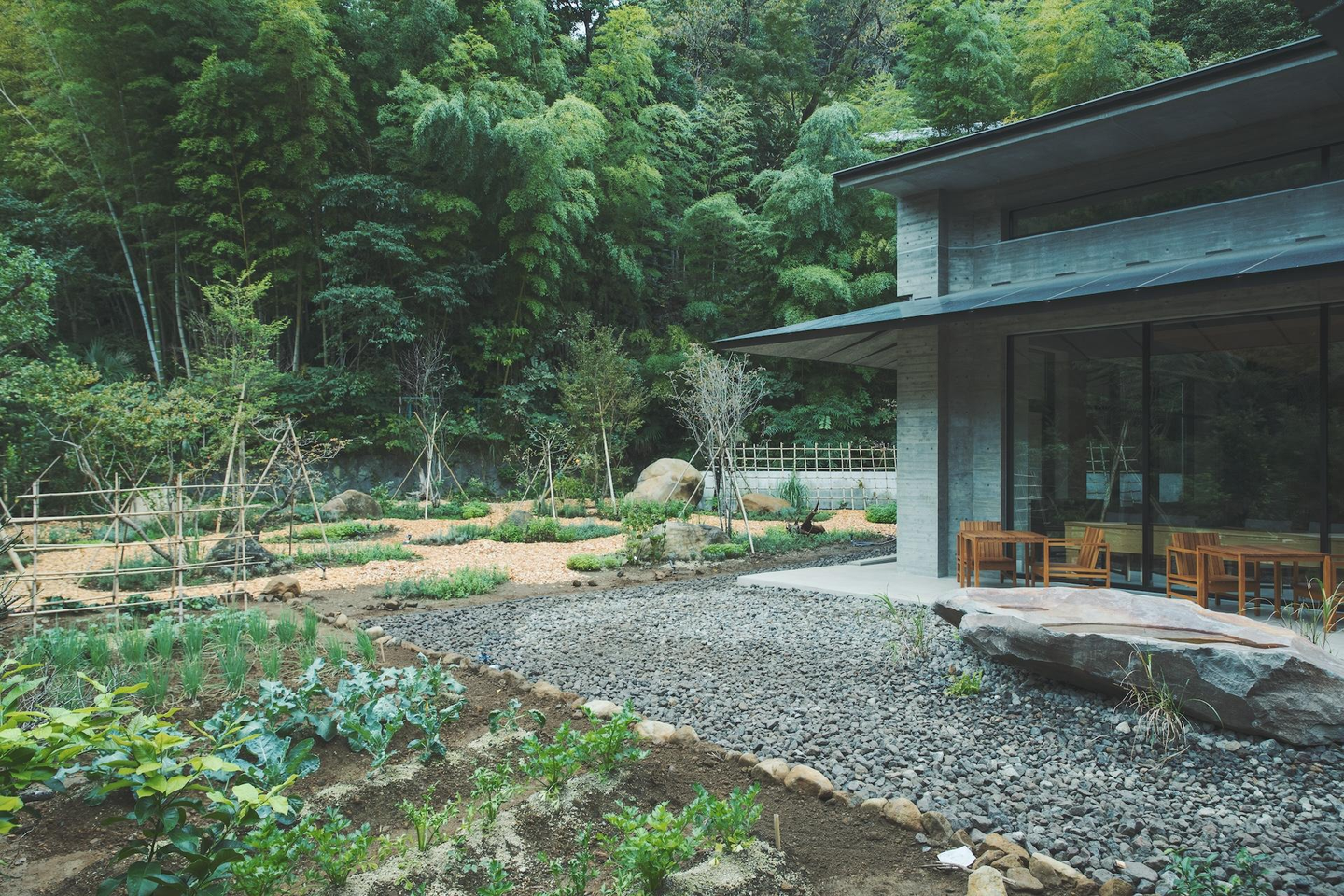宿の敷地内にある「里庭」では、景色を眺めながらのんびりと過ごせるだけでなく、季節によっては野菜やハーブの収穫体験ができます。さらに、SOKI ATAMIの特徴でもある石を贅沢に配置しました。日本三大銘石の一つ「本小松石」を使用していて、採掘されたままの加工されていないものを器として見立てをすることで、素の器のコンセプトを表現しています。