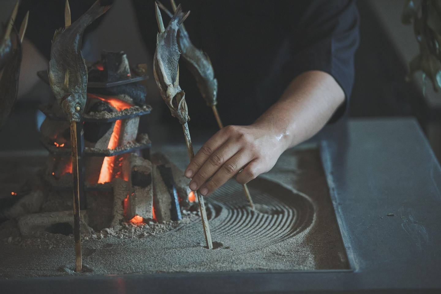 食事のコンセプトは「郷土食=風土色」。静岡の地で採れた旬の食材を、できるだけシンプルに調理し素材の色や風味を活かした料理を提供しています。オープンキッチンに置かれた炉では、火元を見ながらゆっくりと食材が調理されていく姿を楽しむことができ、より滋味深い体験ができます。一般的な温泉旅館のような画一的な和食ではなく、臨場感とともに地域色豊かな「食」を感じていただきたいと考えています。