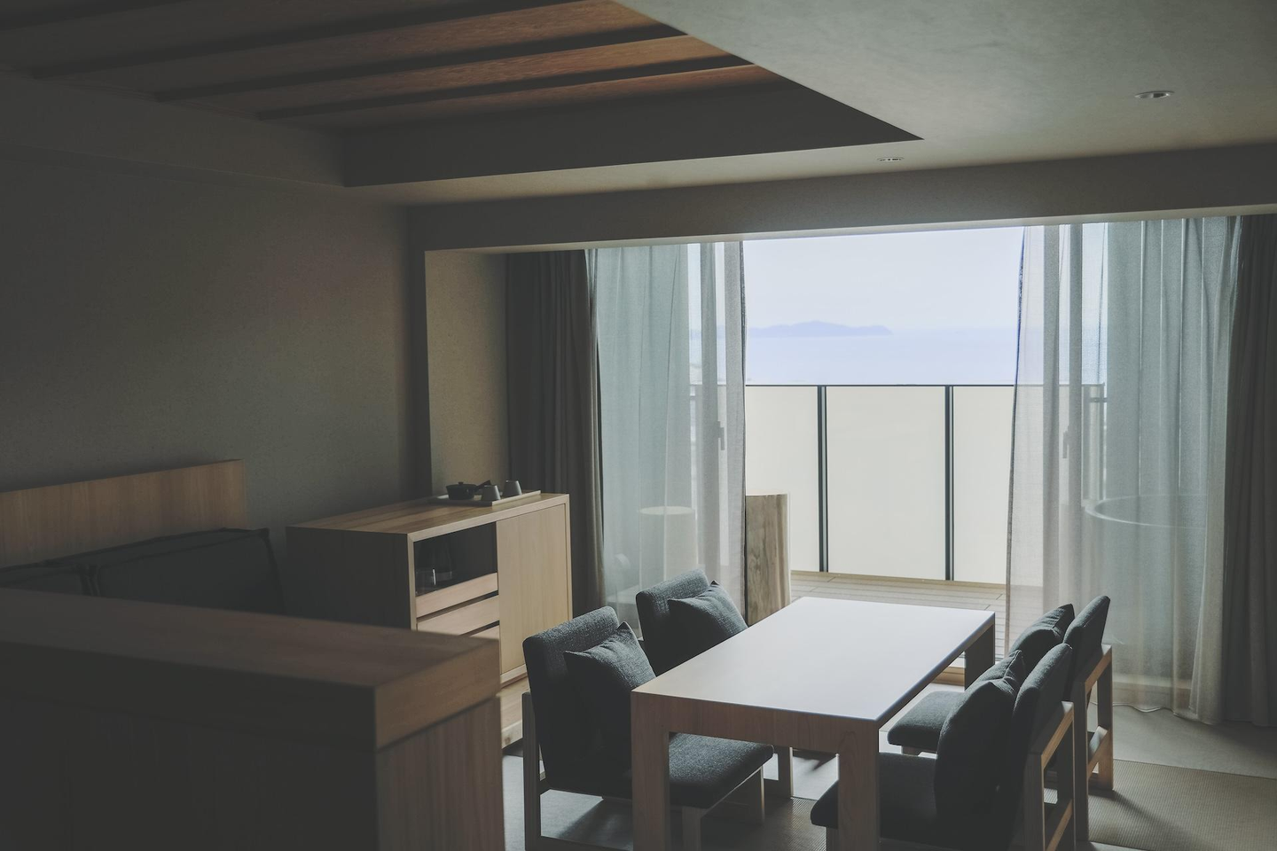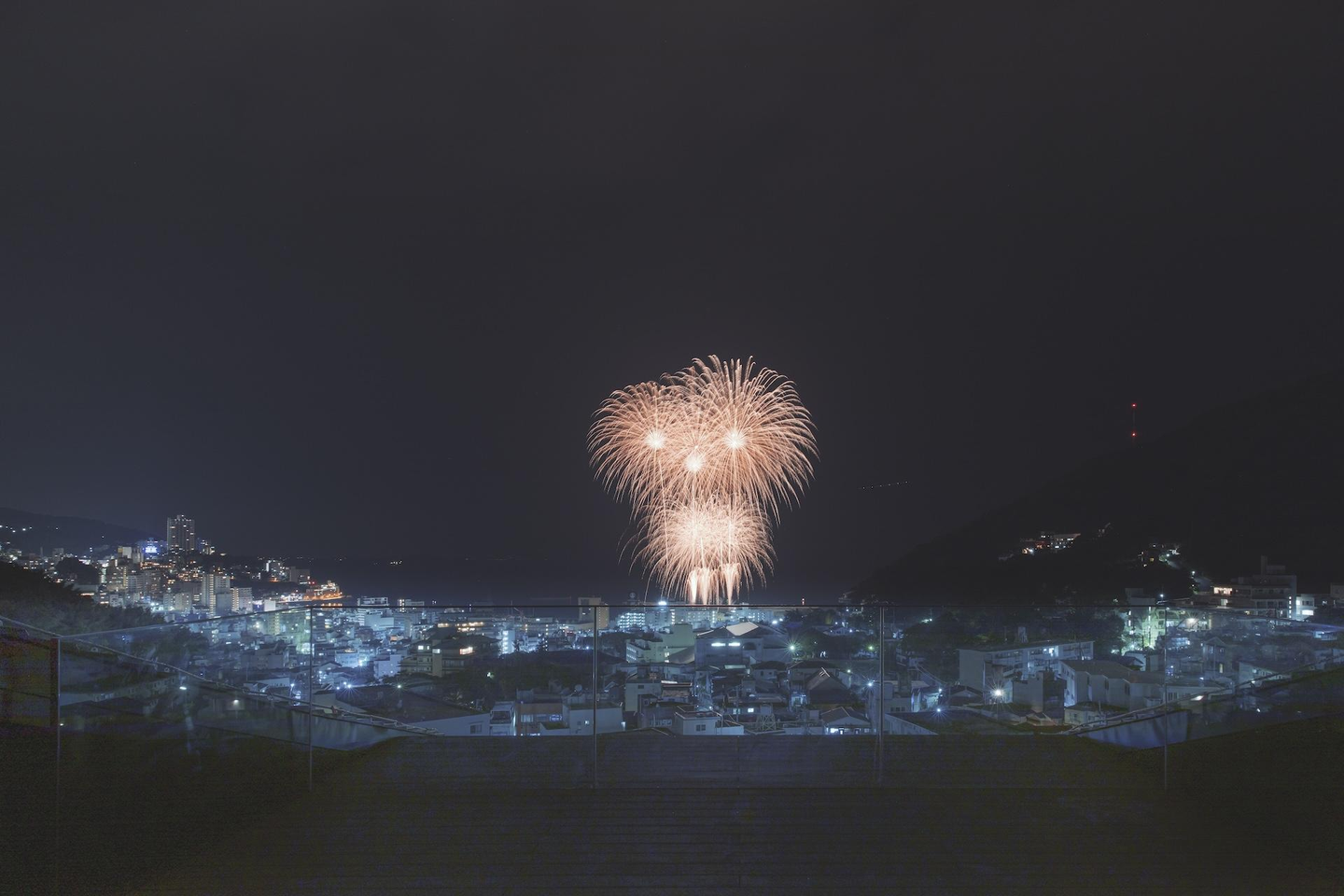 ルーフトップテラスからは熱海湾の景色が一望できます。また、里庭に面した食事処では旧来の旅館にはないオープンキッチンが採用されており、目の前で調理される料理を臨場感をもって楽しめます。