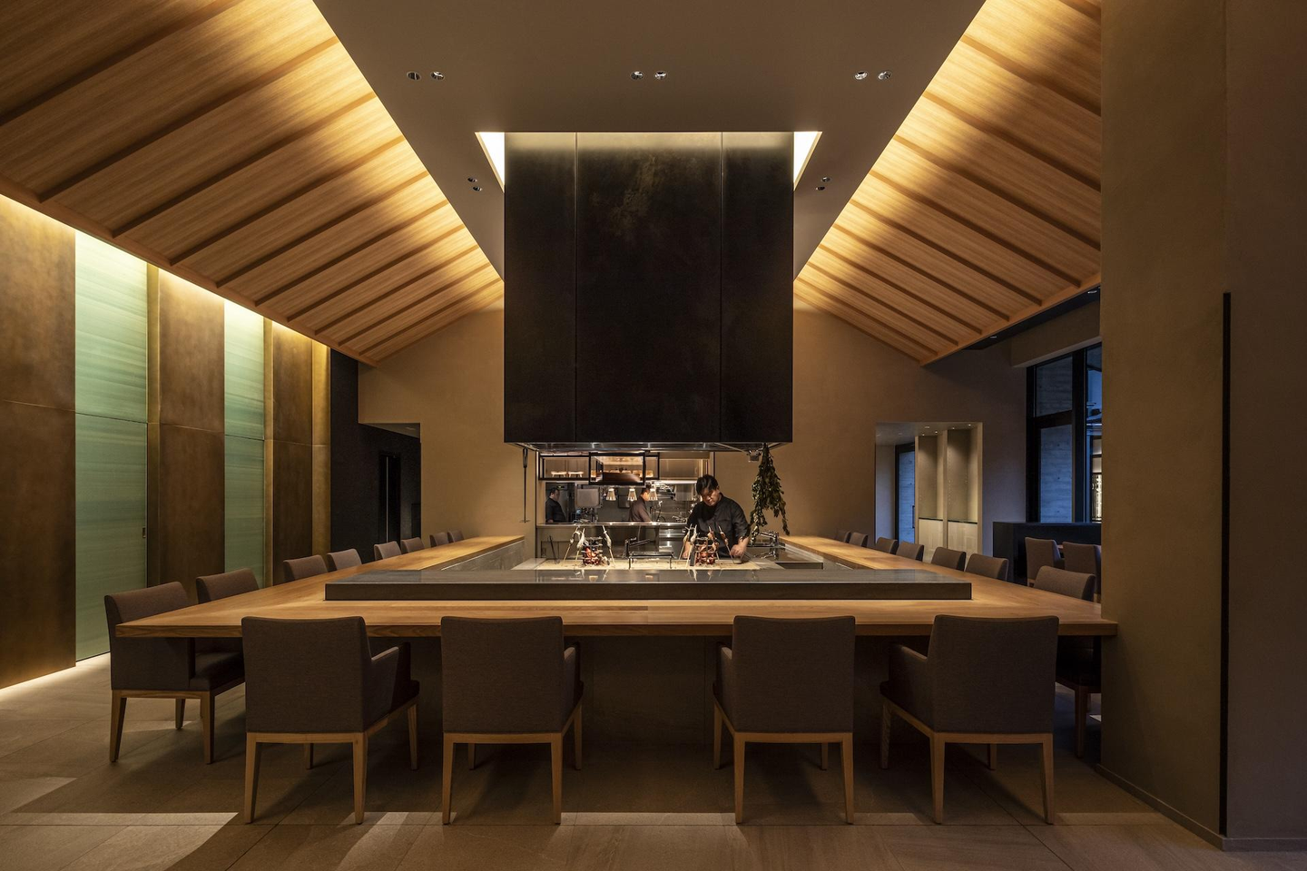 滞在体験の中でも地域や季節を感じる大事な食空間は、宿泊棟とレストラン棟の導線をあえて分けて一度外を歩く体験のシークエンスを加えて期待感を醸成しています。レストラン棟ではインテリアデザイナーageの佐藤一郎氏が手がけ、オープンキッチンから臨場感のある料理を提供できるよう設えています。