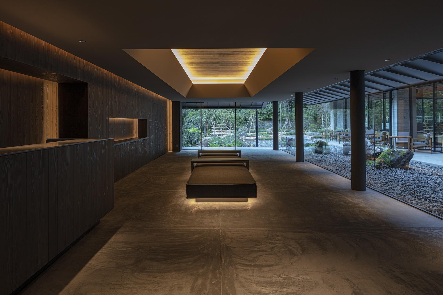 建物は、レセプション棟、レストラン棟、客室棟の3棟からなります。レセプション棟は、ゲストの到着時に、無為自然の滞在を体感してもらう前に一度心をリセットしてもらうための場として設えています。経年による自然な風合いを出すために炭を含んだモルタルによる仕上げや、自然顔料で染色した和紙を天井に使い、落ち着いた雰囲気を演出しています。