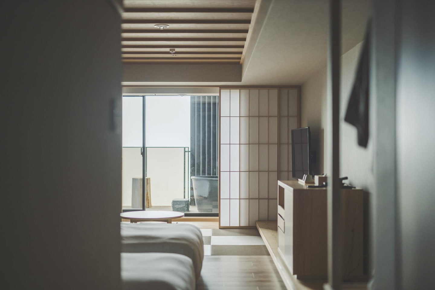客室でも、木を用いた内装で素材感を感じられるデザインで整えられ、自然光の入る時間の柔らかい明るさと夜には照明の演出で心地よい暗さを感じられるよう、コントラストを感じるデザインにしました。昔ながらの宿らしさも忘れず、引き戸の設えや鎧戸をイメージした建具など、伝統的なデザインが取り入れられています。