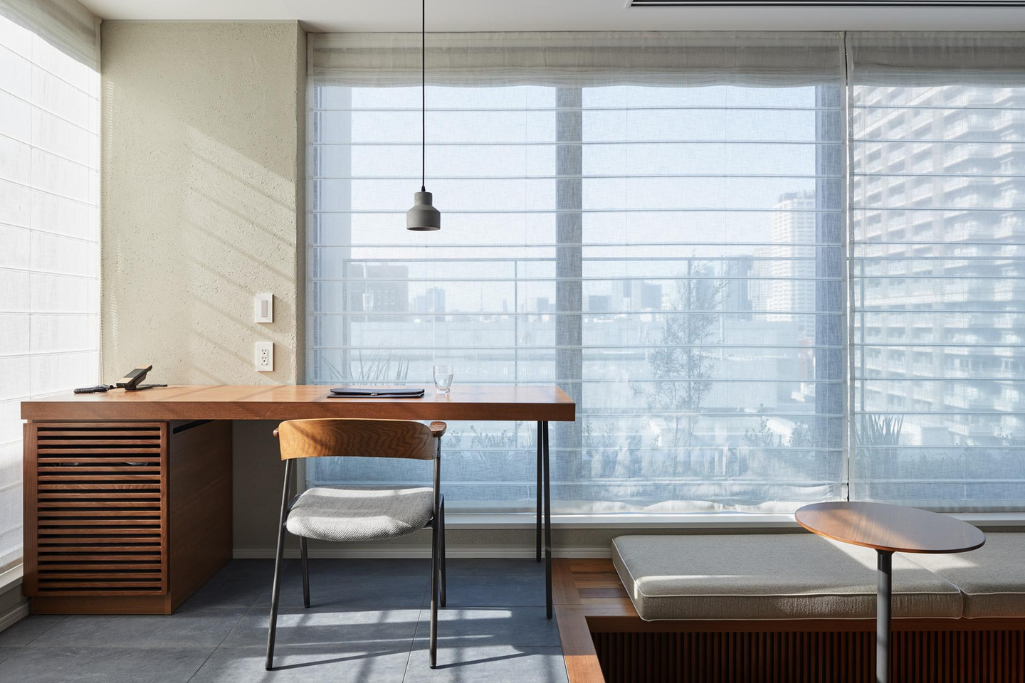 日本の障子を使いやすくした形で、さらに透過する光を楽しめるように、障子の横木や透け感を再現したローマンシェードを採用しました。