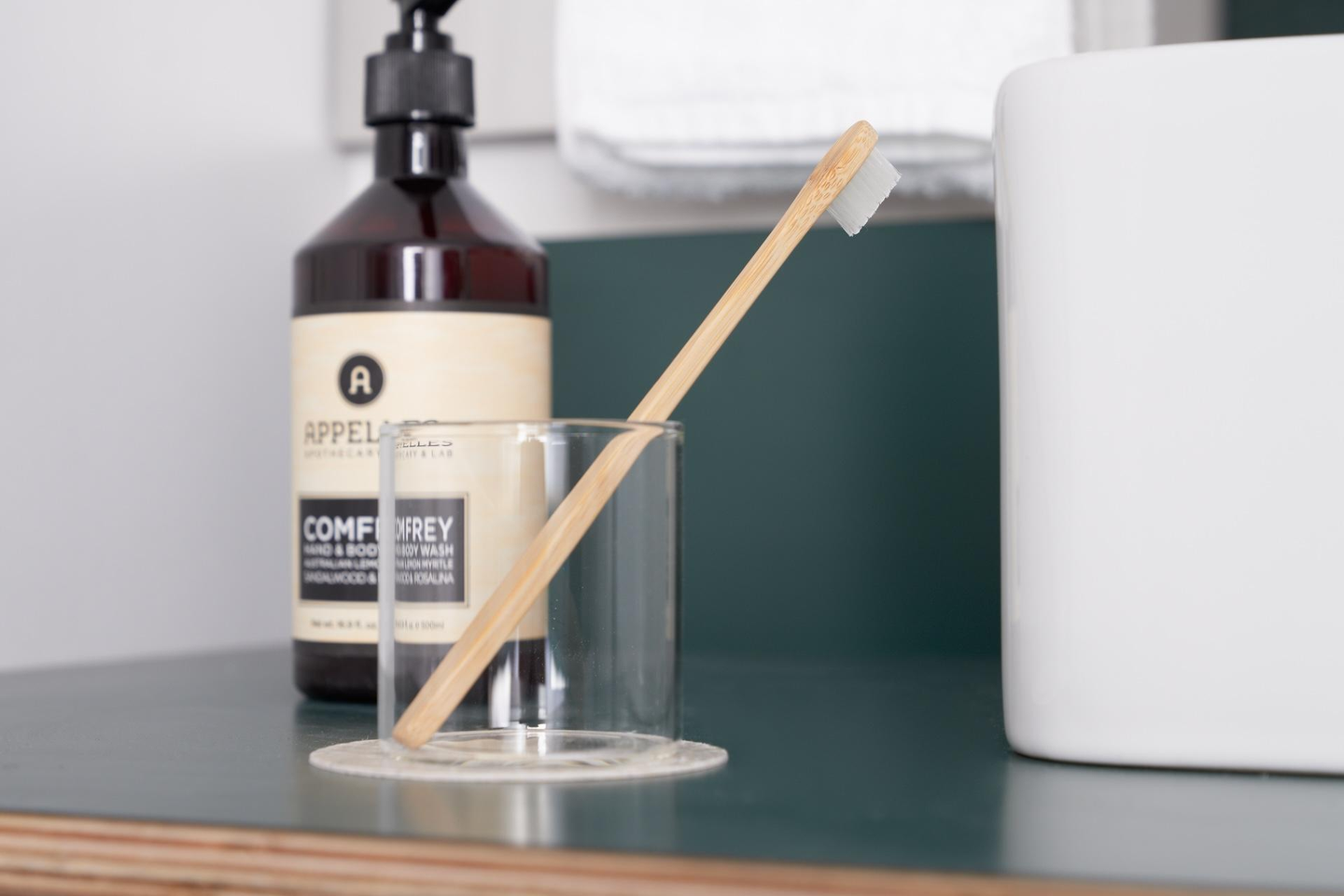 部屋のアメニティは環境に配慮したものを選定し、必要なものはフロントで配っています。客室内の竹歯ブラシや歯磨きペーパーは「MiYO ORGANIC」、石鹸やシャンプーはオーガニックブランド「APPELLES」。サンダルは廃棄されたタイヤを再利用したものです。
