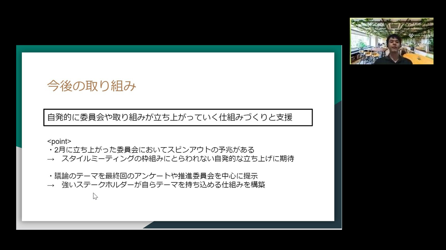 今はUG STYLE MTGをきっかけに委員会を立ち上げていますが、今後は社員が自発的に委員会を立ち上げられる環境にしていきたいです。